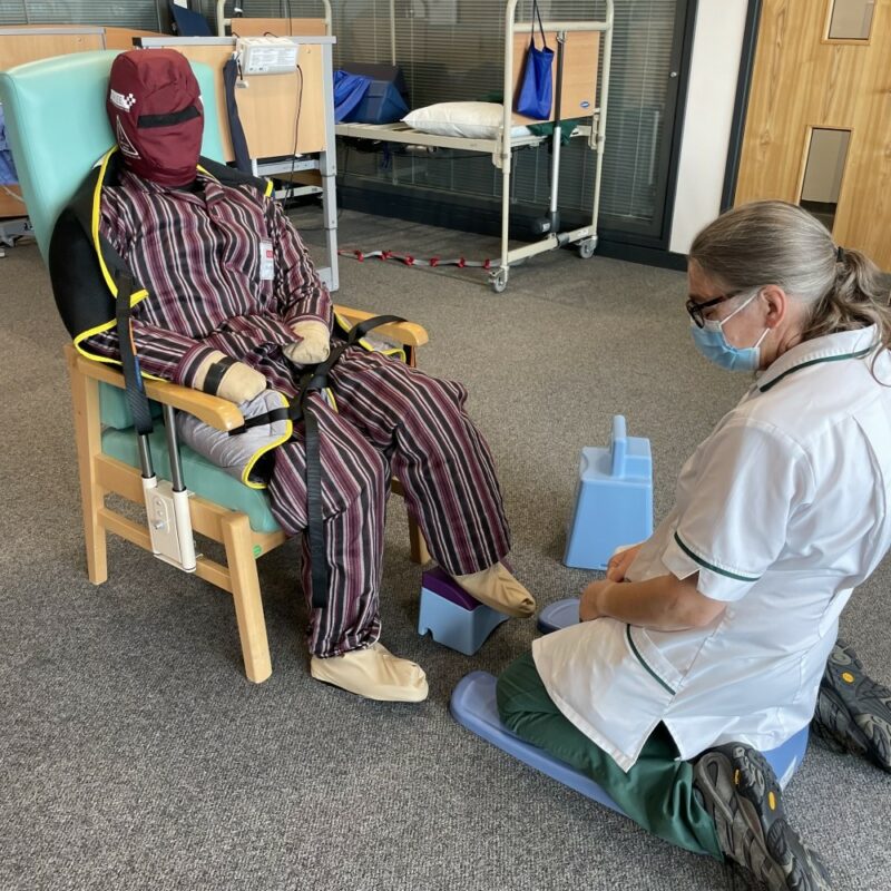 Conçu avec un colonne vertebrale/épine en plastique qui permet au mannequin de s’assoir dans une chaise roulante, un lit ou être déplacé à l’aide d’un soulève malade – comme un patient le ferait.